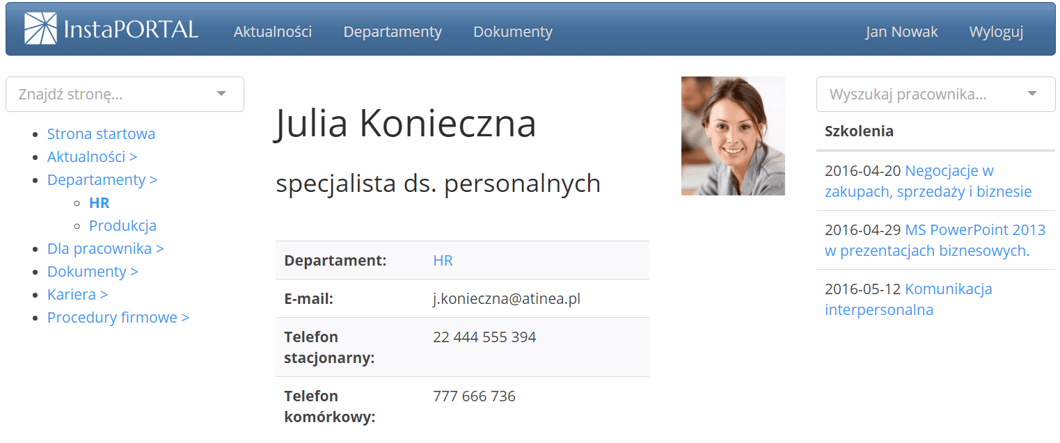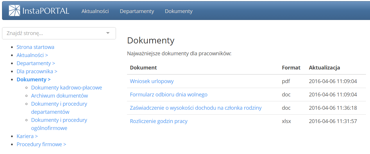 - portalu informacyjnego pozwalającego pracownikom na wygodny dostęp do najważniejszych informacji i dokumentów,