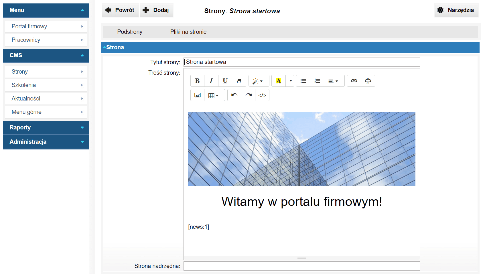 - edytor WYSIWYG dla treści stron