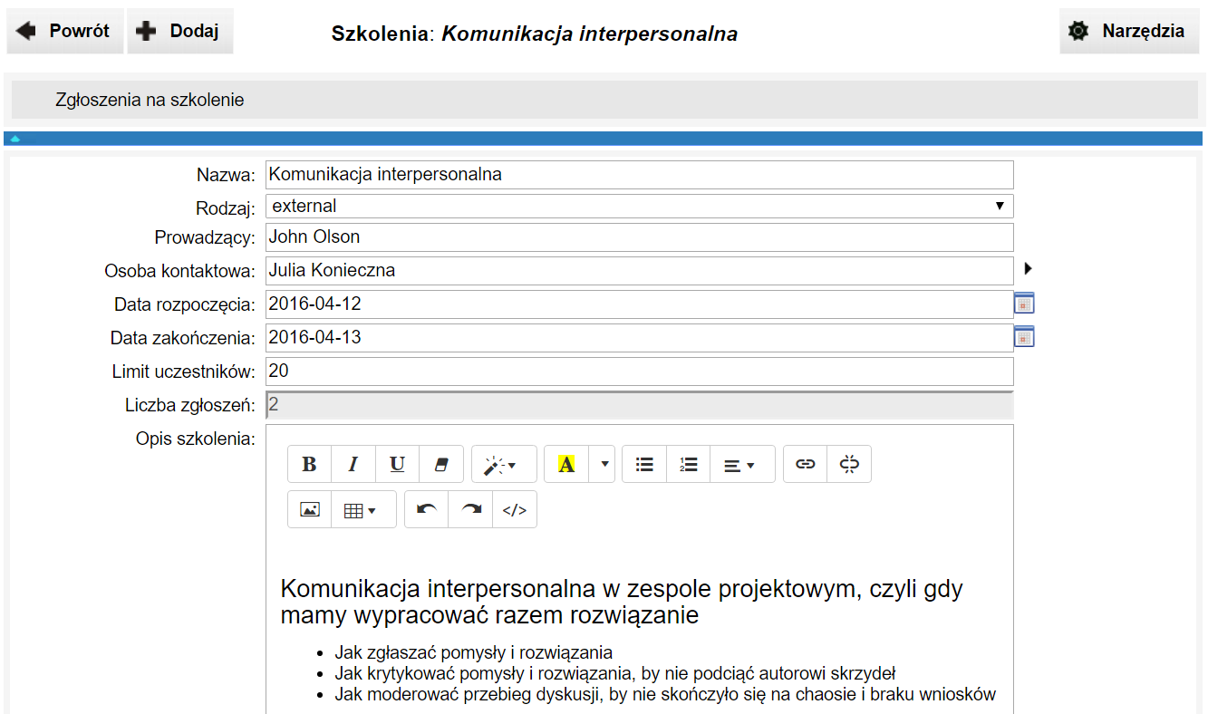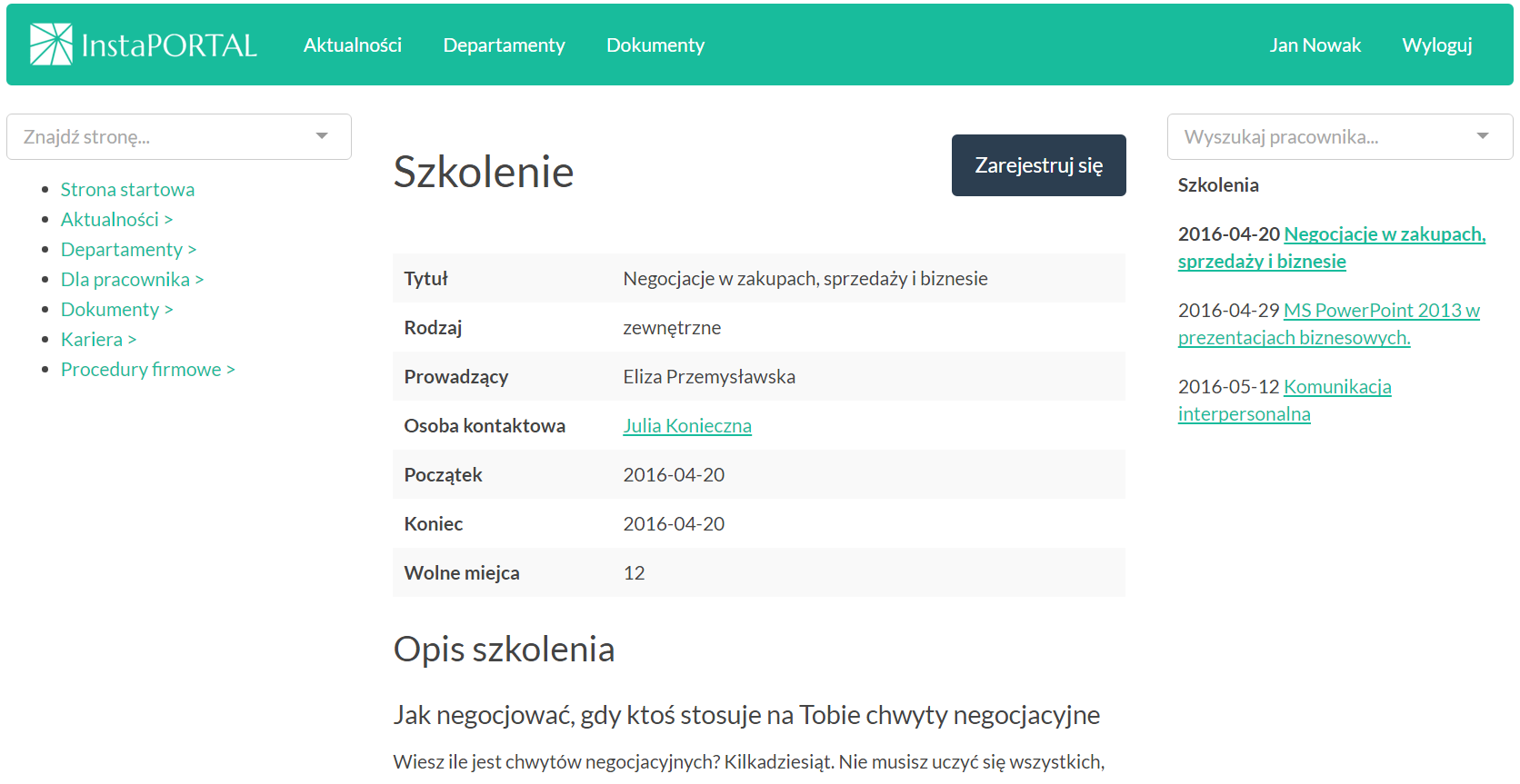 - rejestracja na szkolenia.