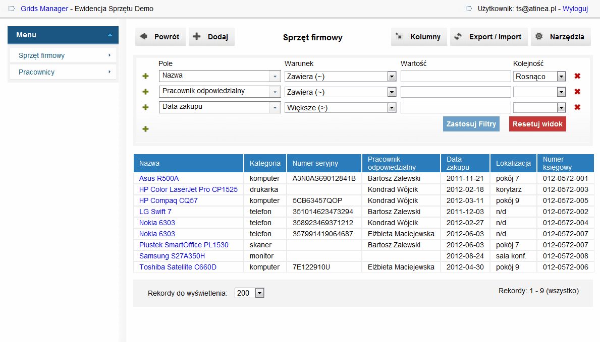 - przypisywanie urządzeń do pracowników, którzy za nie odpowiadają,