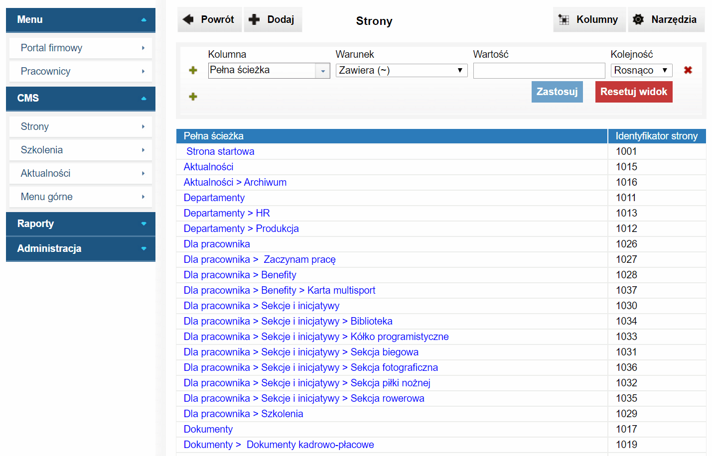 - lista wszystkich stron, dokumentów, aktualności, itp.
