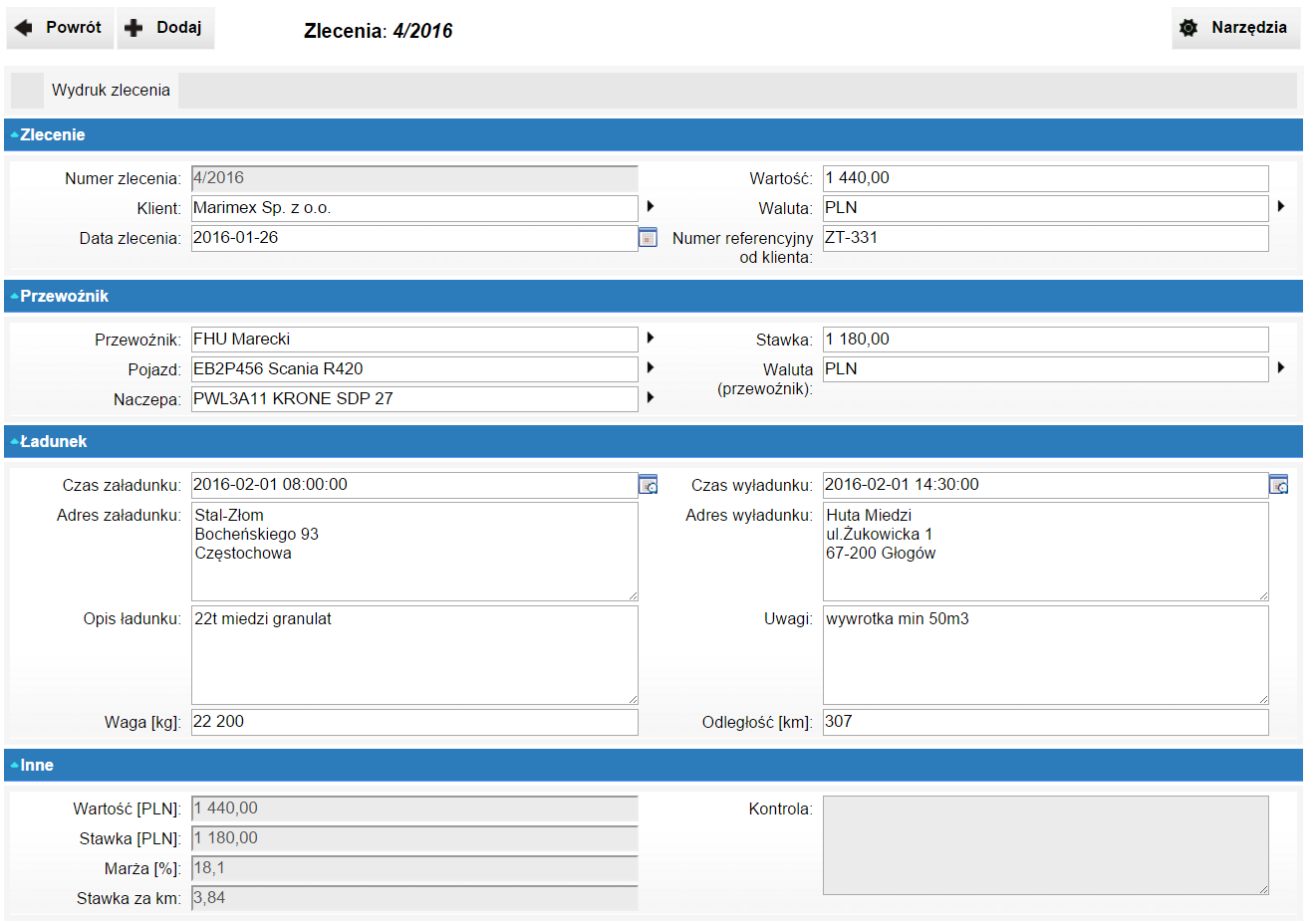 - kluczowe parametry zlecenia - towar, waga, wymiar, temperatura, towary niebezpieczne, itp.