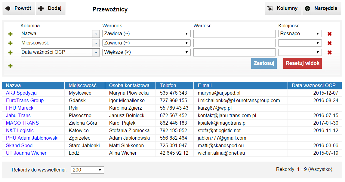 - generowanie przypomnień o dokumentach do przewoźników