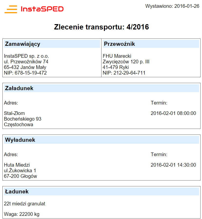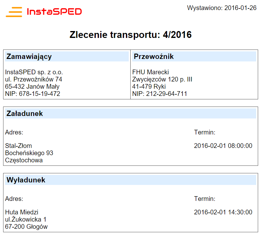 - generowanie dokumentu zlecenia wg indywidualnego szablonu